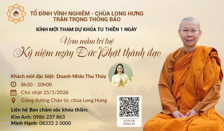 🙏 TỔ ĐÌNH VĨNH NGHIÊM – CHÙA LONG HƯNG TRÂN TRỌNG KÍNH MỜI QUÝ PHẬT TỬ Tham dự KHÓA TU THIỀN 1 NGÀY với chủ đề: 🌱 ƯƠM MẦM TRÍ TUỆ PHÁT TRIỂN CÁC PHẨM…